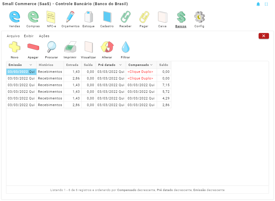 O Controle Bancário é utilizado para controlar as contas bancárias. Este módulo permite conciliação de saldos. Na própria tabela dos registros poderá ser realizada a conciliação, basta clicar duas vezes sobre a data de compensado e o sistema preencherá com a data atual. O saldo do caixa, somente será atualizado, se o campo compensado estiver preenchido.